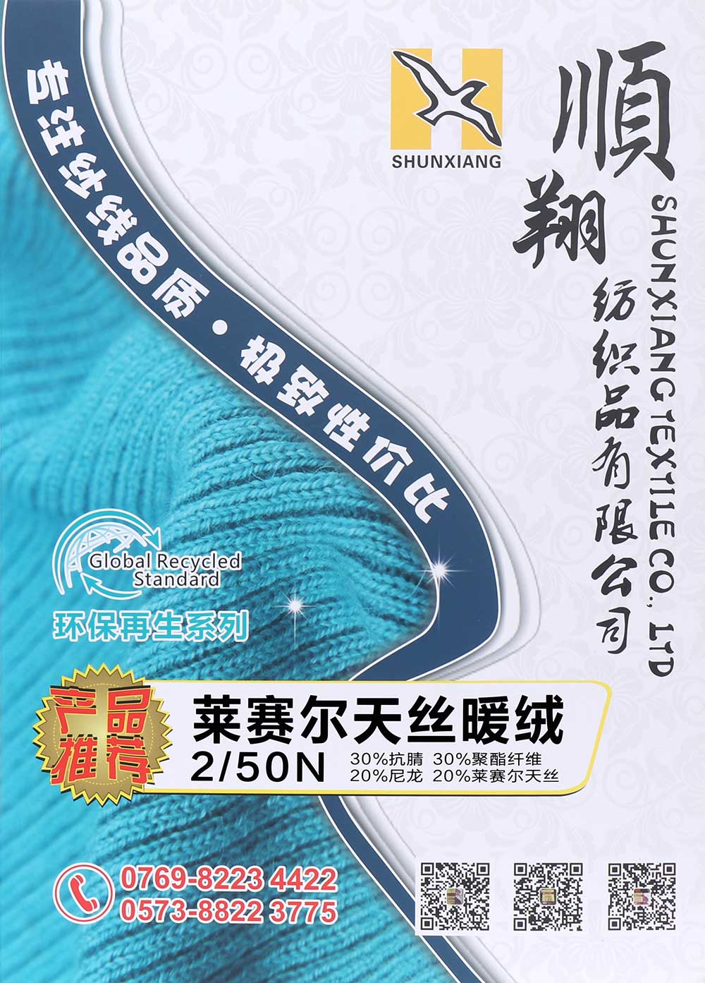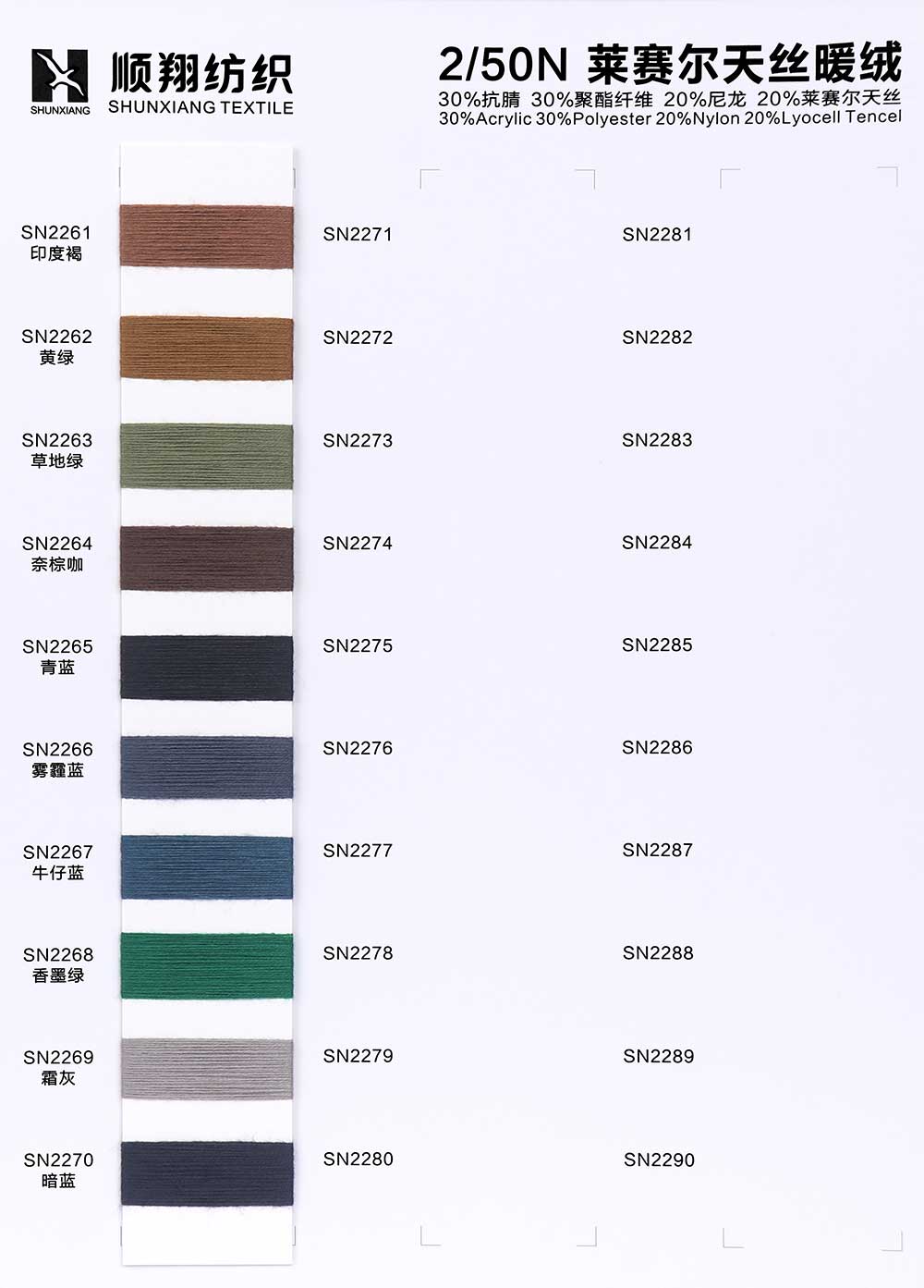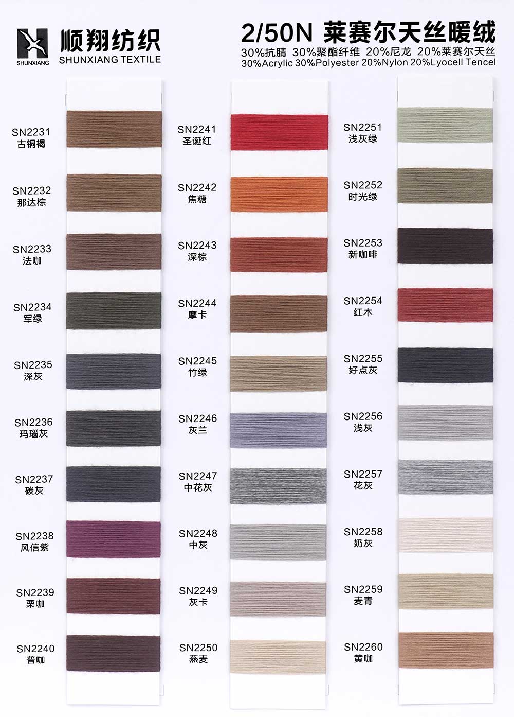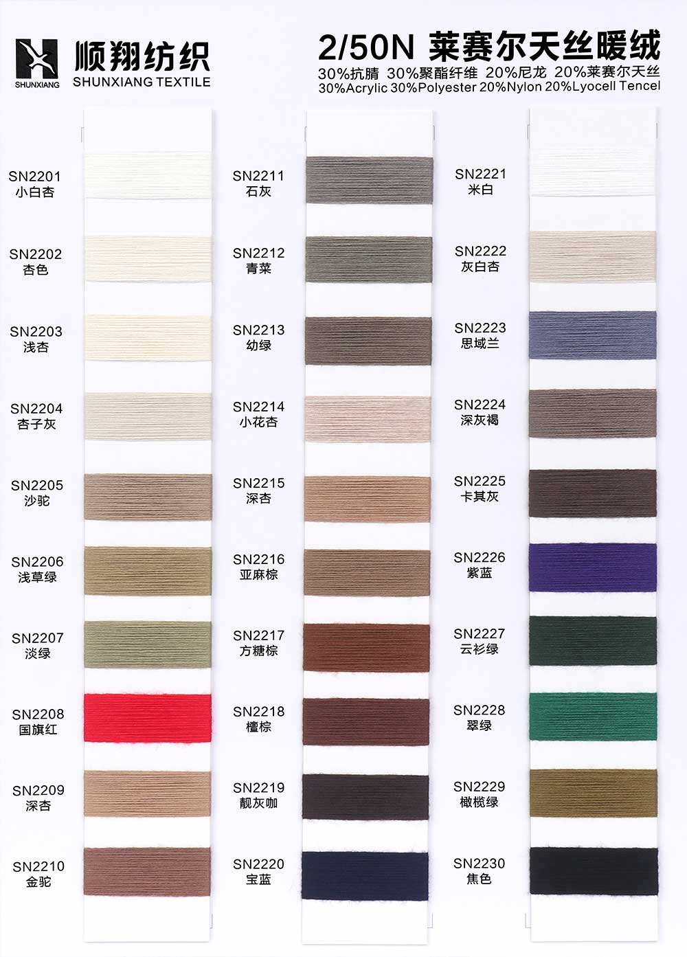 30%抗腈Anti-Pilling Acrylic 30%涤纶Polyester 20%尼龙Nylon 20%莱赛尔天丝Lyocell Tencel