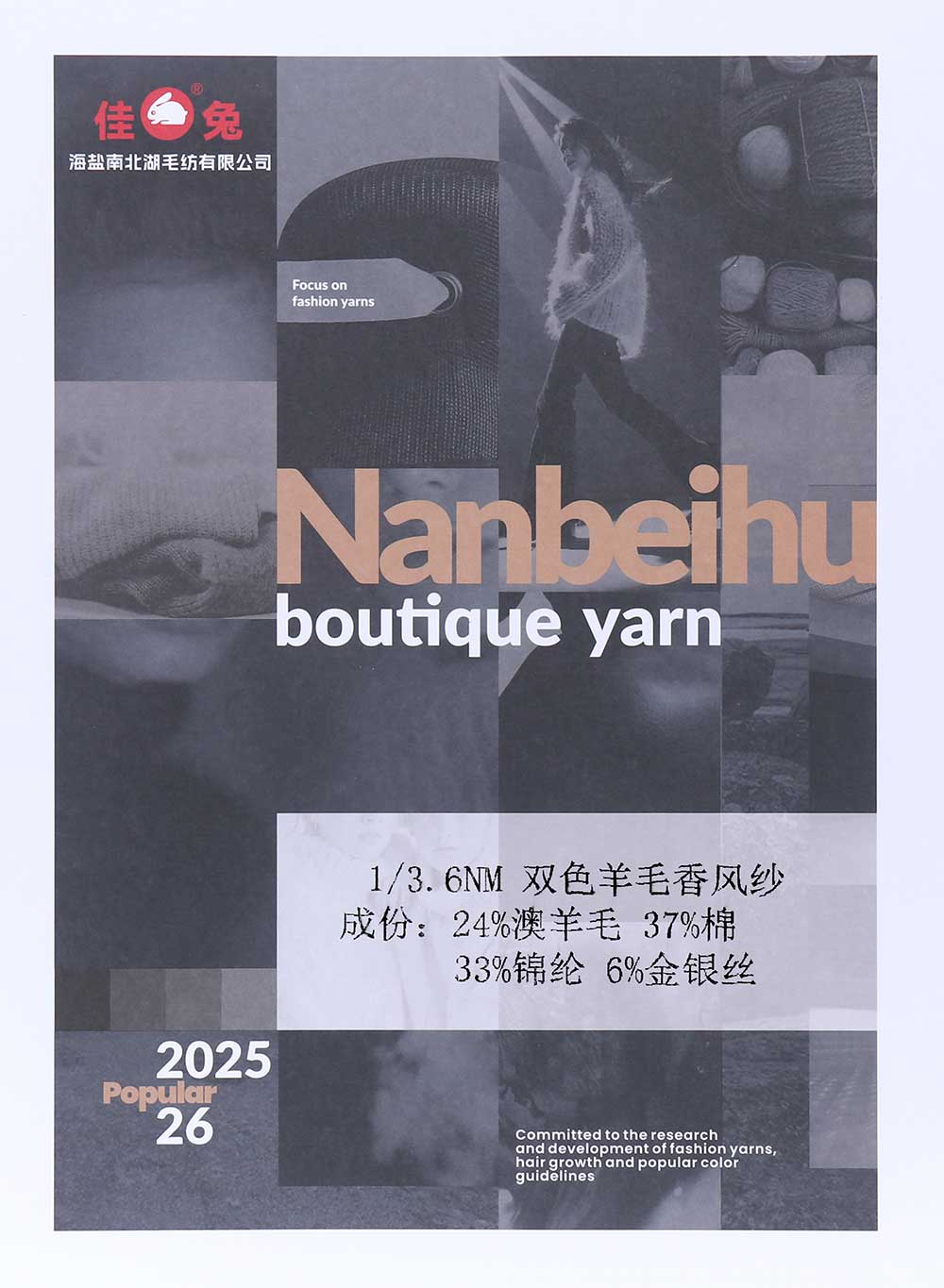 24%澳羊毛Wool 37%棉Cotton 33%锦纶Nylon 6%金银丝Metallic