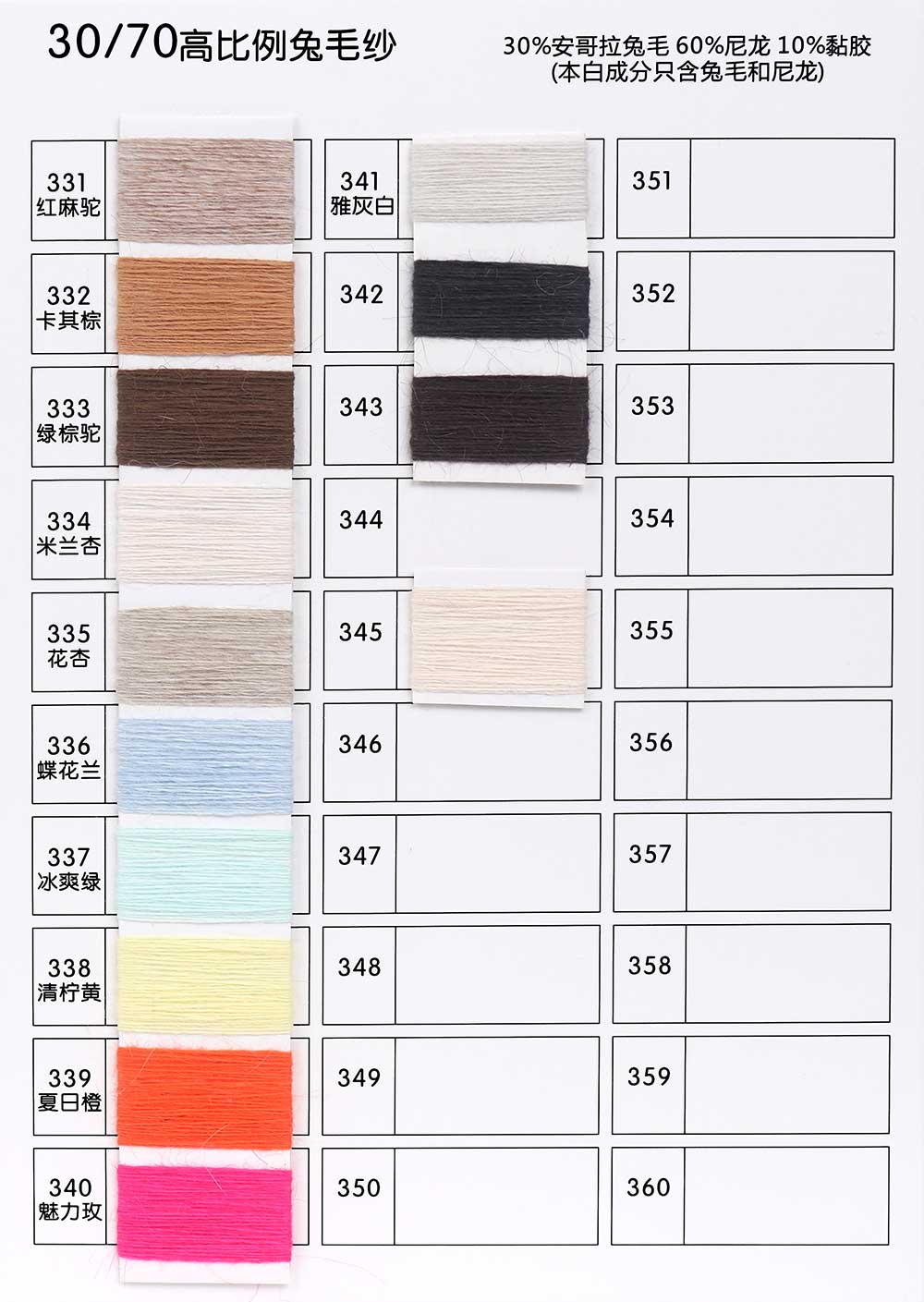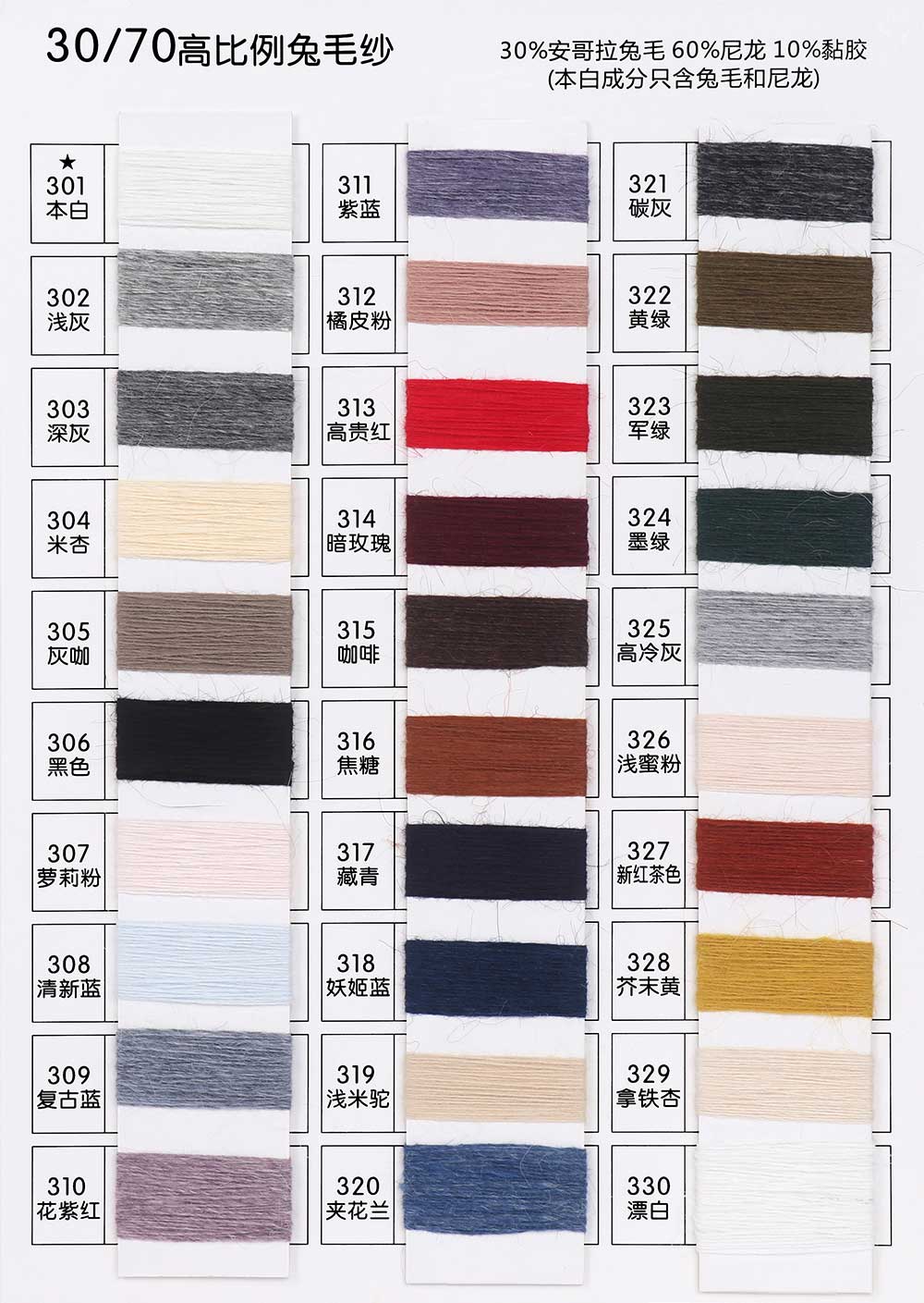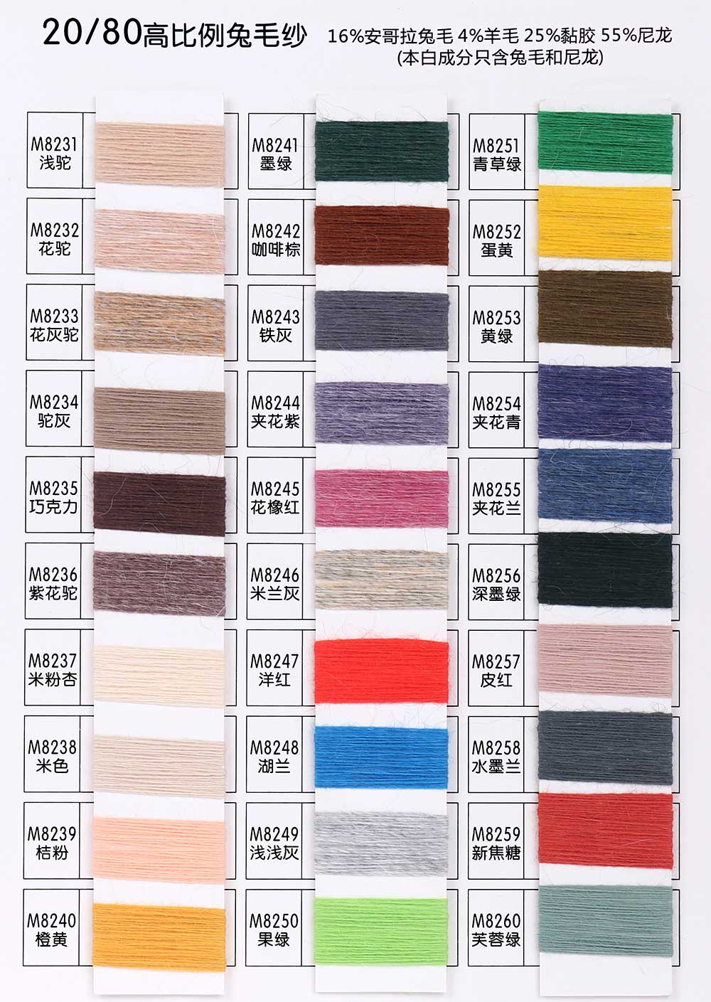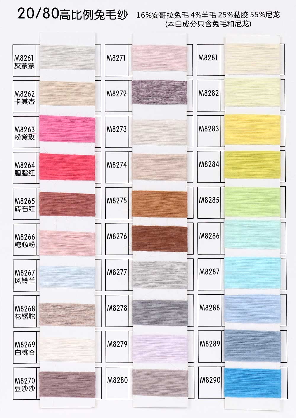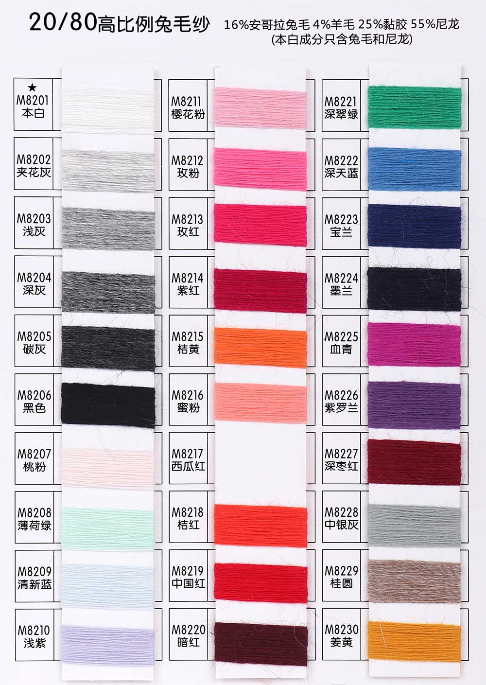 16%安哥拉兔毛Angora 4%羊毛Wool 25%黏胶Viscose 55%尼龙Nylon/30%安哥拉兔毛Angora 60%尼龙Nylon 10%黏胶Viscose