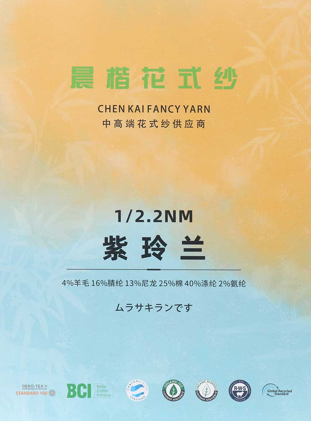 4%羊毛Wool 16%腈纶Acrylic 13%尼龙Nylon 25%棉Cotton 40%涤纶Polyester 2%氨纶Spandex