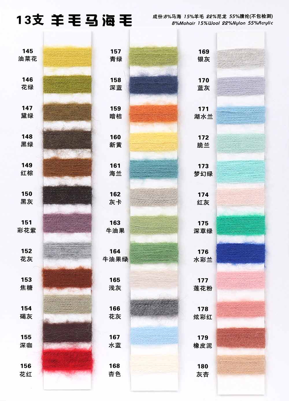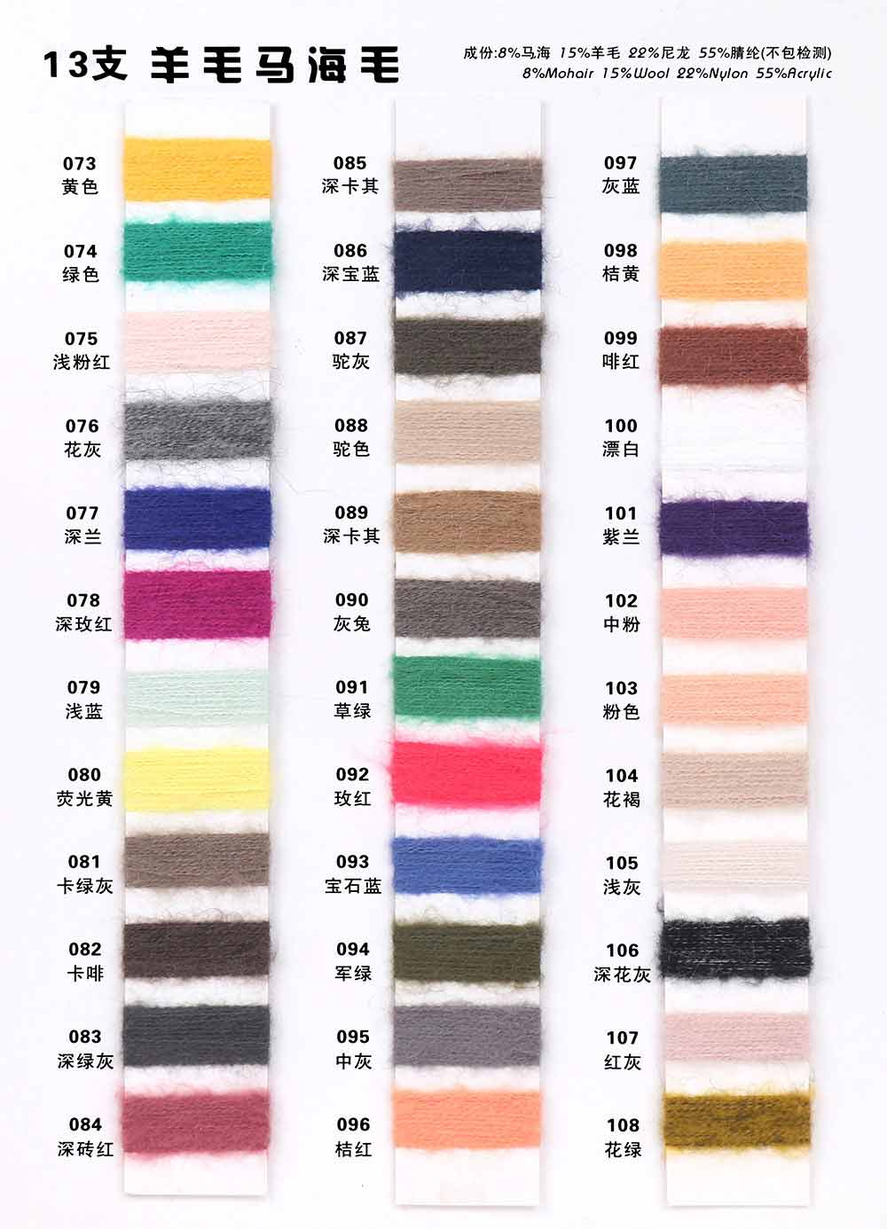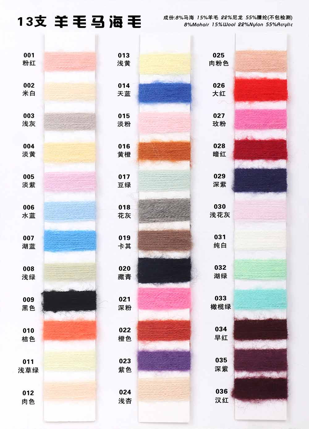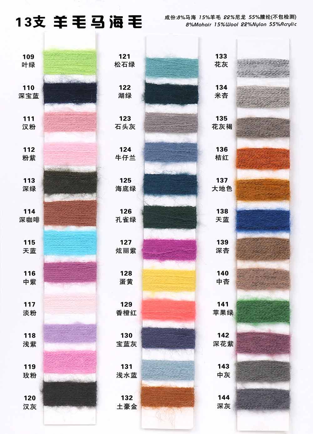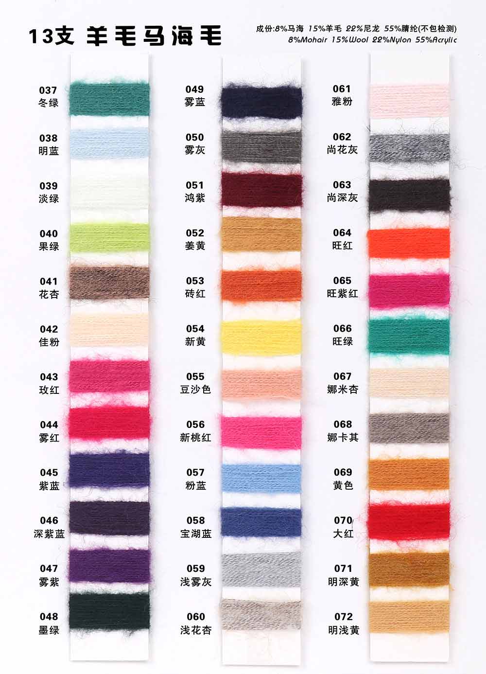 8%马海毛Mohair 15%羊毛Wool 22%尼龙Nylon 55%腈纶Acrylic